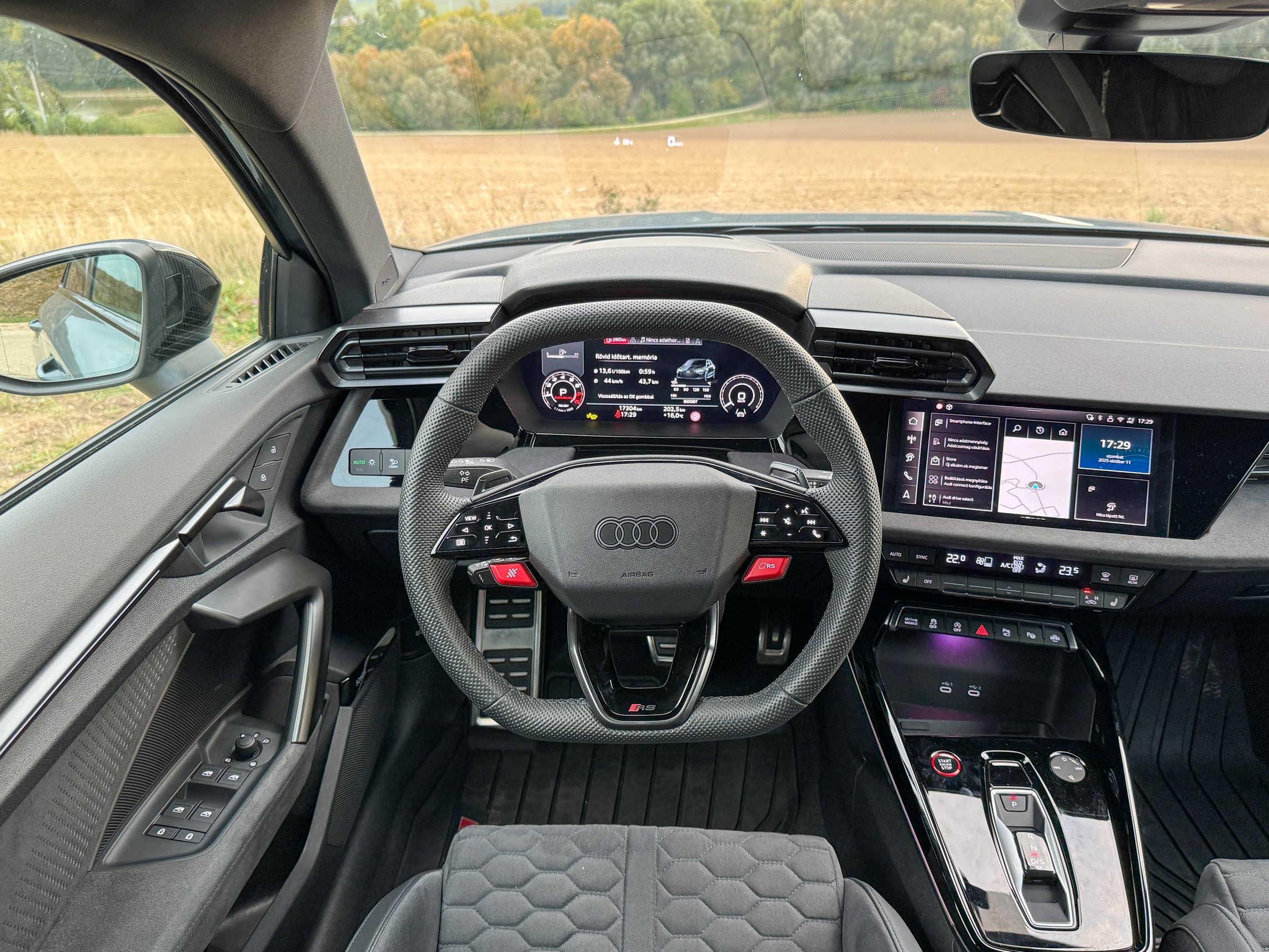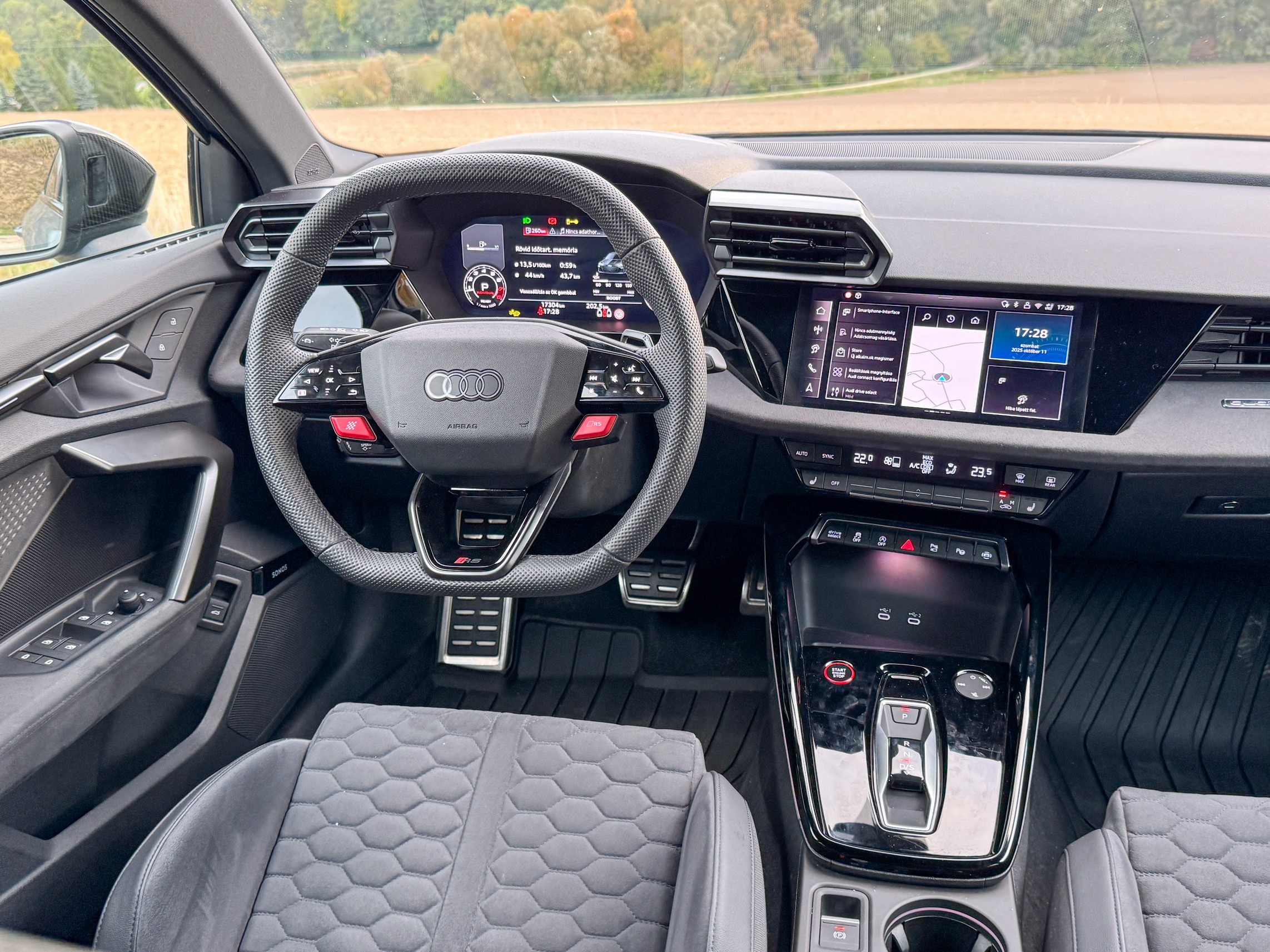 A tesztelt változatban a rally örökséget és a modern sportautózás esszenciáját a prémium opciók teszik teljessé. A súlycsökkentésben és az oldaltartásban élen járnak a Sabelt karbonhélyas alkantara ülések, amelyek a vezetőt és utasát a lehető legmélyebben kötik az autóhoz. A fékrendszer is ehhez az erőhöz méretezett: az opcionális, nagyteljesítményű kerámia fékek elöl (375 mm) hideg és meleg állapotban egyaránt garantálják a maximális lassulást, körről körre. Ezek a fűszerek teszik az amúgy sem ízetlen RS 3-at egy igazi versenyautó-klónná, melyet akár a mindennapokban is használhatunk – ha bírjuk a kísértést.