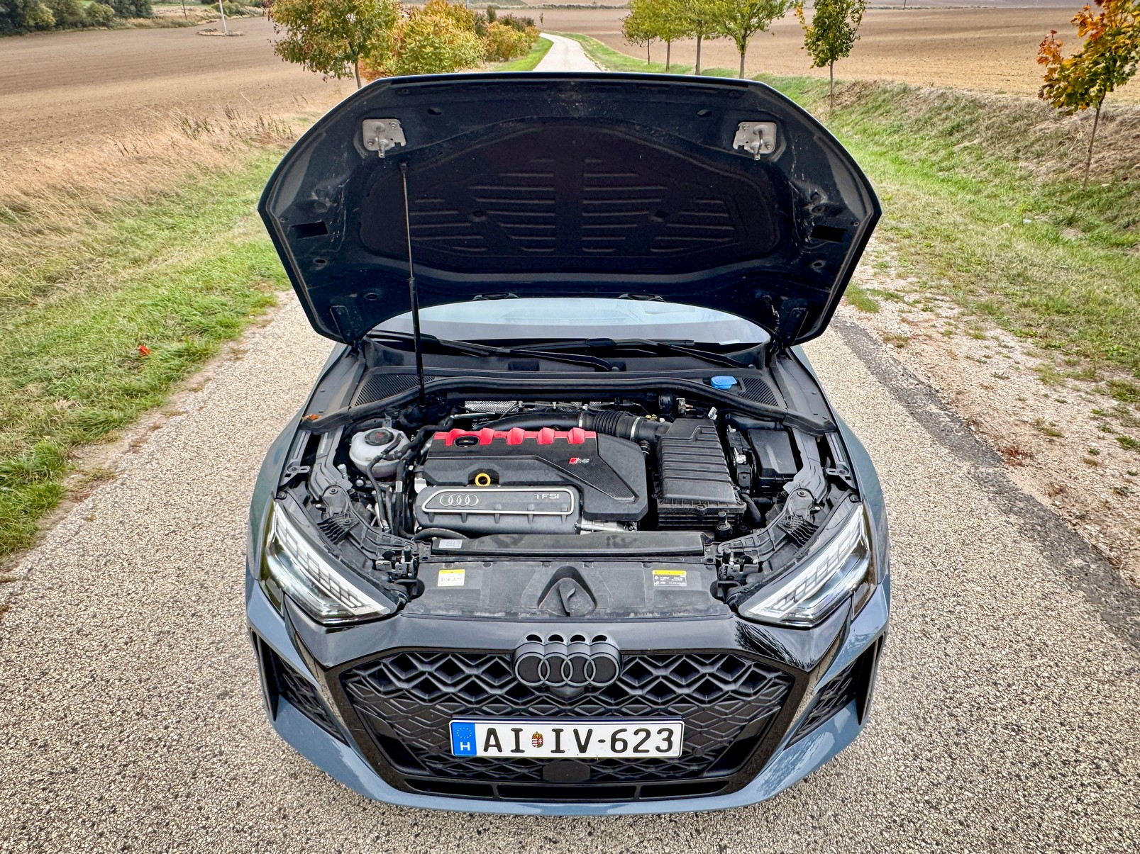 A modern RS 3 lelke változatlanul az ikonikus 2.5 literes, soros, öthengeres TFSI turbómotor, melynek hangja már önmagában egy időutazás a nyolcvanas évek versenypályáira. 400 lóerejével (294 kW) és lenyűgöző 500 Nm nyomatékával az erőforrás letaglózó. A karakteres, egyedi ritmusú hangzást a különleges gyújtási sorrendnek (1−2−4−5−3) köszönheti, ami azonnal megkülönbözteti a versenytársaktól. Nem véletlen, hogy ez a motor sorozatban nyerte el a "Év motorja" díjat, hiszen a nyers erőt kifinomult technológiával ötvözi.