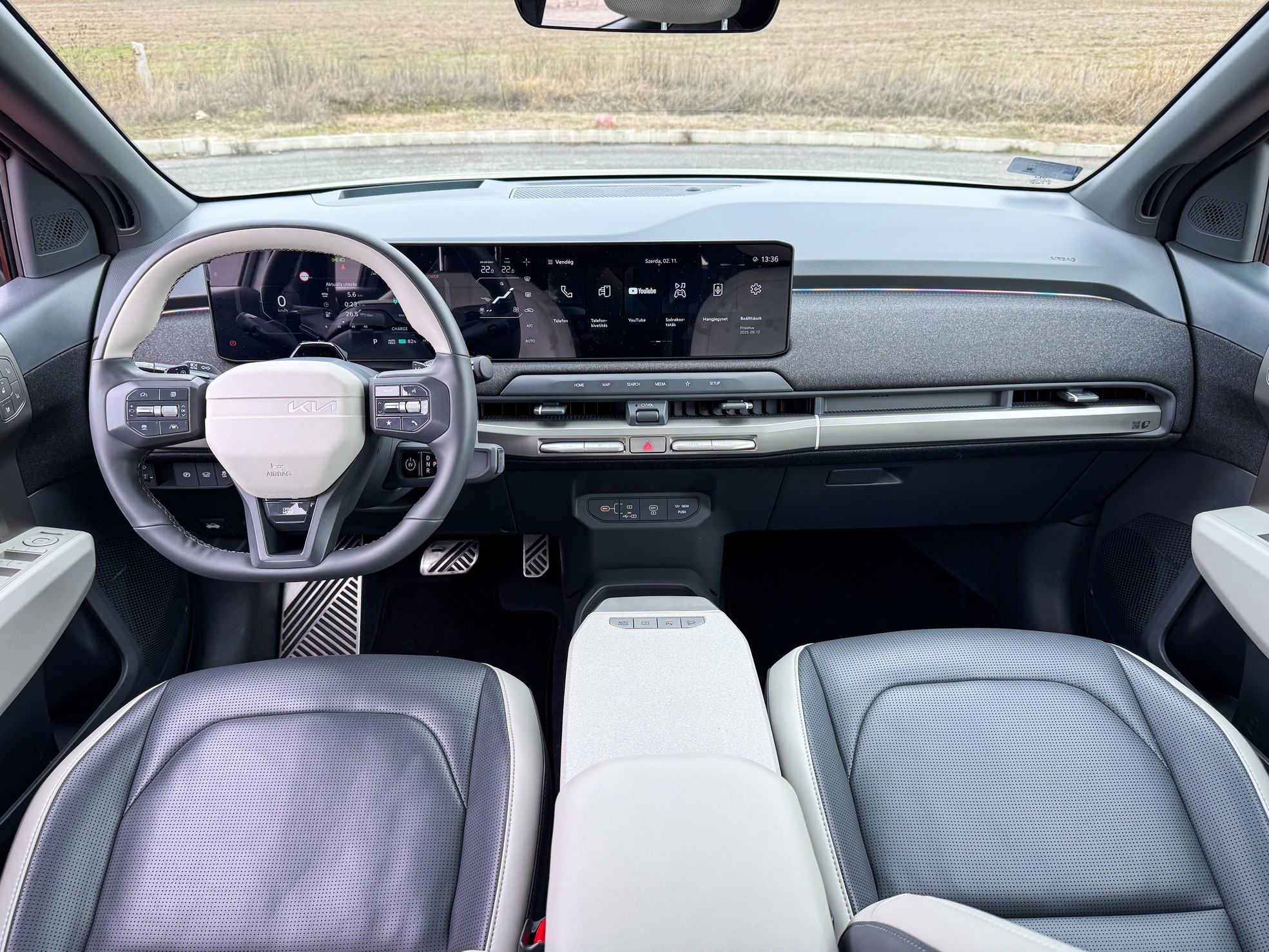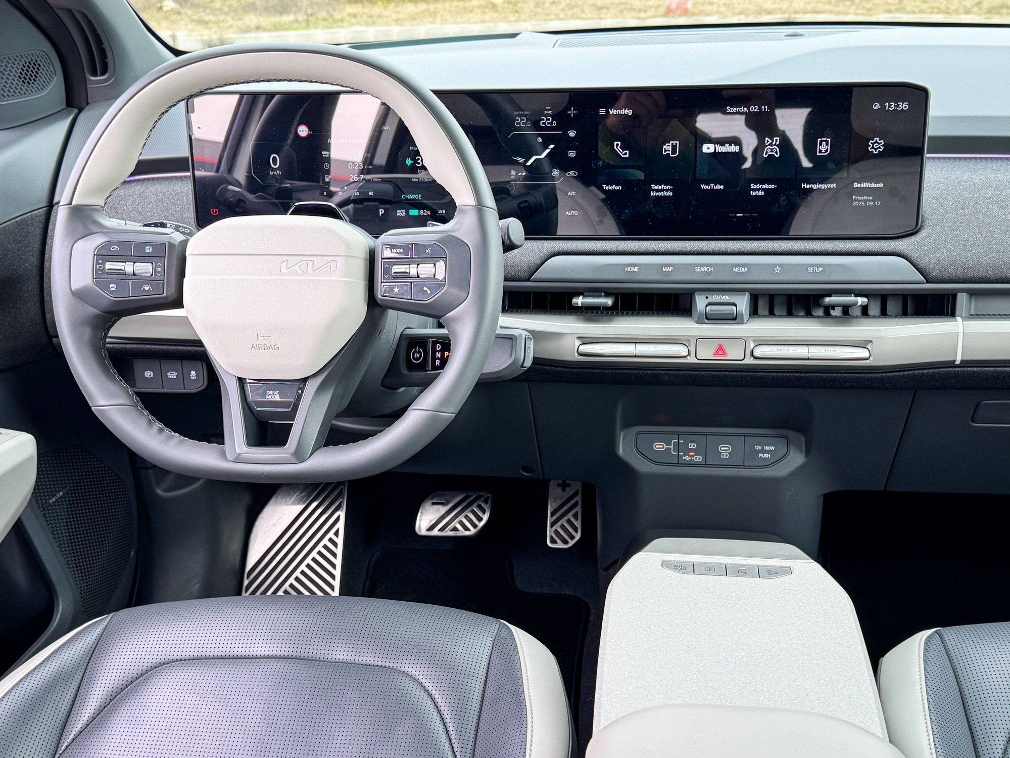 Ha már a hangulatnál tartunk: a tesztautóban lévő Harman Kardon high-end hifi rendszer egyszerűen fantasztikusan szól! Olyan tiszta, telt és dinamikus a hangzása, hogy a töltési szünetekben legszívesebben csak ülnénk a kocsiban és hallgatnánk a kedvenc albumainkat.