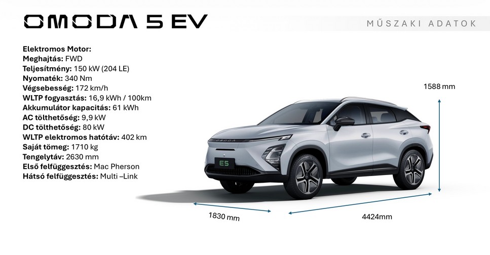 Az Omoda egy igazán új szereplőnek mondható az Európai autópiacon. Az OMODA 5 EV a modern technológia, fenntarthatóság és prémium életérzés találkozása. Célja, hogy a jövőorientált, tudatos és stílusos városi autósok számára kínáljon fejlett, kényelmes és karakteres elektromos SUV-t.