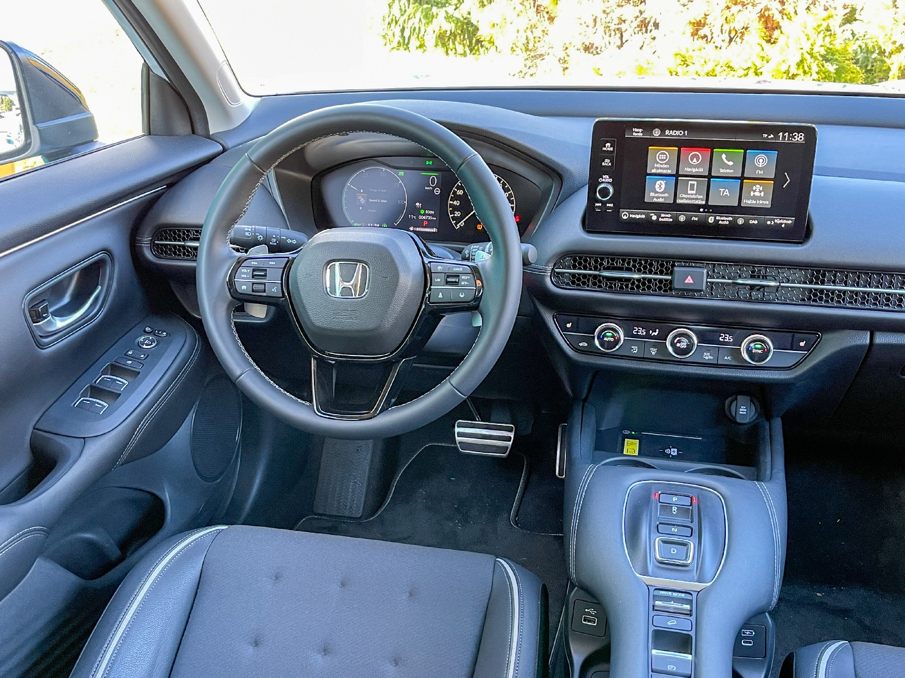 A ZR-V, illetve a most megjelenő új Hondák igazi attrakciója a hybrid hajtásuk, amely véleményem szerint fejlettebb, mint a legtöbb konkurensé. Az meghajtás lényege röviden az, hogy a 2 literes 143 lóerős (186Nm nyomatékkal) benzinmotorhoz két, egy kisebb és egy nagyobb villanymotor kapcsolódik. A benzinmotor képes aggregátorként a kisebb villanymotoron keresztül az akkumulátort tölteni vagy ha szükséges, direktben is meg tudja hajtani az autót. Ez mindig a közlekedési helyzet függvénye. A nagyobb villanymotor pedig önállóan is képes mozgatni a járművet. Úgy tapasztaltam, hogy városi közlekedés során szinte soha nem kacsolódott be a benzinmotor a meghajtásba. Alapvetően a rendszer automatikusan dönt a meghajtás módjáról, de ki is tudjuk kényszeríteni a tisztán elektromos mozgást. A rendszer összteljesítménye 184 lóerő és impozáns, 7,9 mp alatt képes a 100-as sprintre.