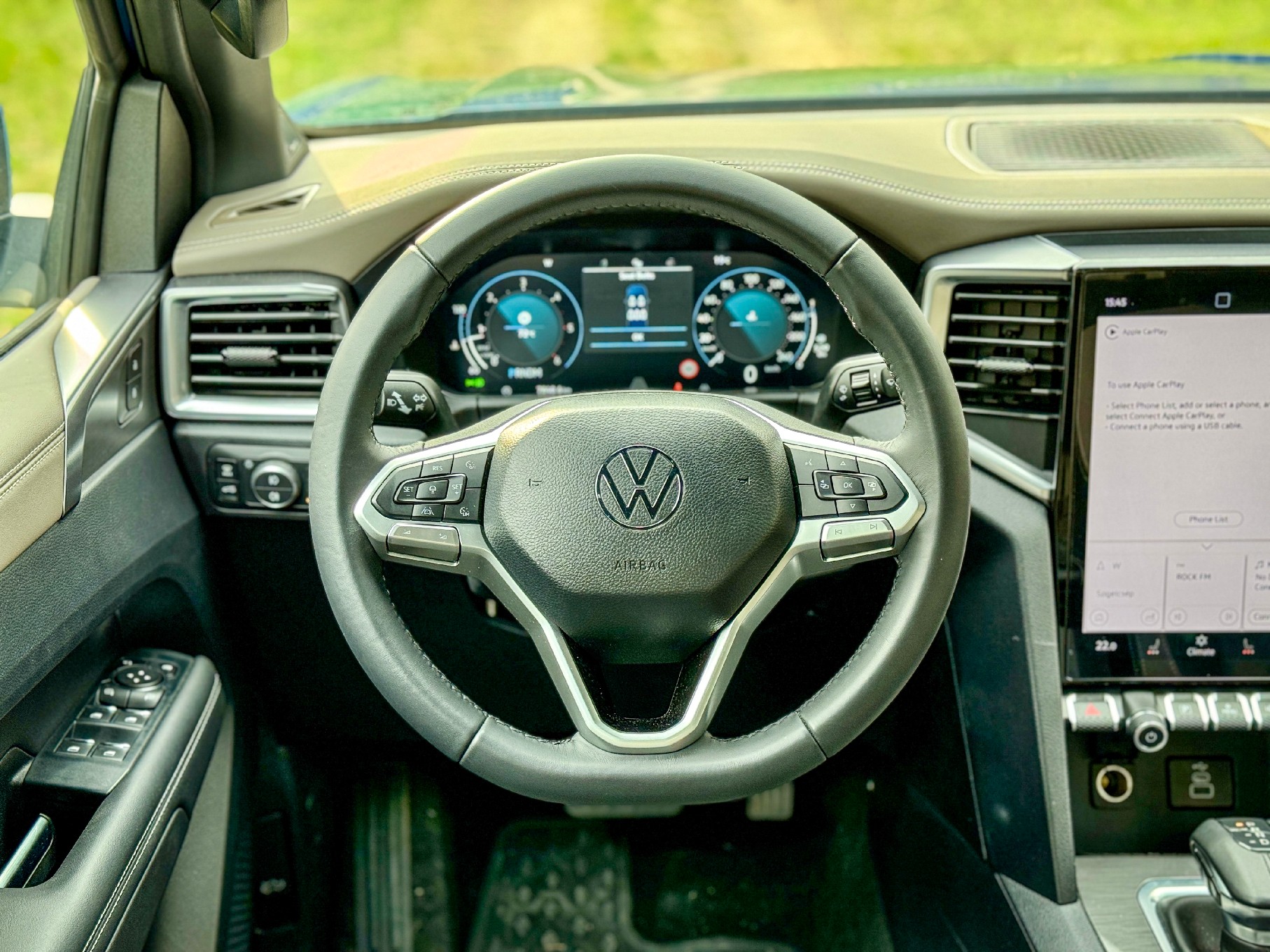 Az Amarok tehát a magasabb minőséget, megjelenést igyekszik bemutatni a Ranger egyszerűbb megjelenésével szemben. Ez az elképzelés jól megmutatkozik az utasfülkében is. Természetesen azt a gondolatot el kell, hogy engedjük, hogy az Amarok személyautókra hajazó vezetési komforttal vár. De a prémium minőség egyértelműen jelen van. Remek a beltér kialakítása. A hatalmas 12”-es álló formátumú infotainement a legszembetűnőbb rész, amely alatt fizikális gombok is találhatóak. A VW természetesen nem bírta ki, hogy ne digitalizálja a belteret ahol lehet, így a Rangerhez képest egy fizikális gombsort száműztek középről, amely helyére érintőgombok kerültek. Szerintem kár volt a klíma kezelést így átalakítani, de mondjuk azt, hogy a németektől ez a lépés nem volt meglepetés. Szerencsére a kormányon maradtak a rendes gombok és a rádió hangerejét sem azzal a borzasztó tapi felülettel kell vezérelni.