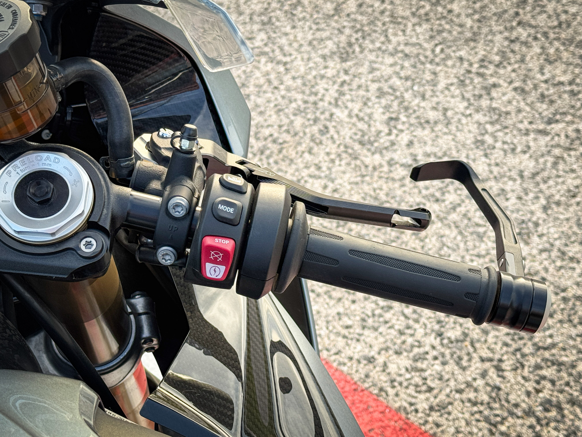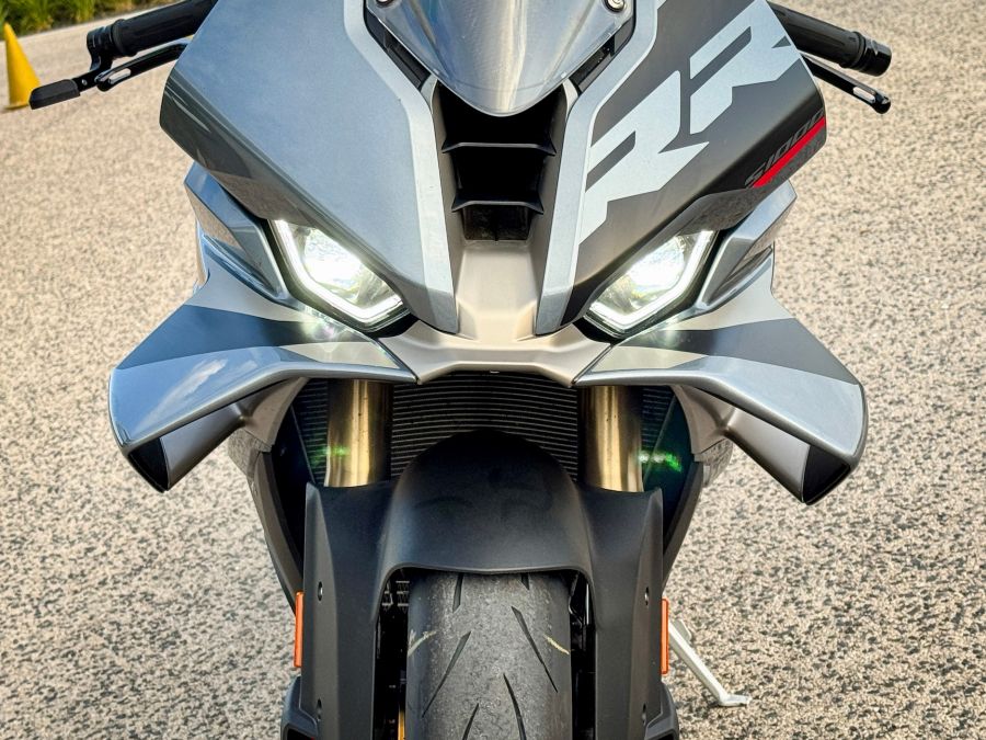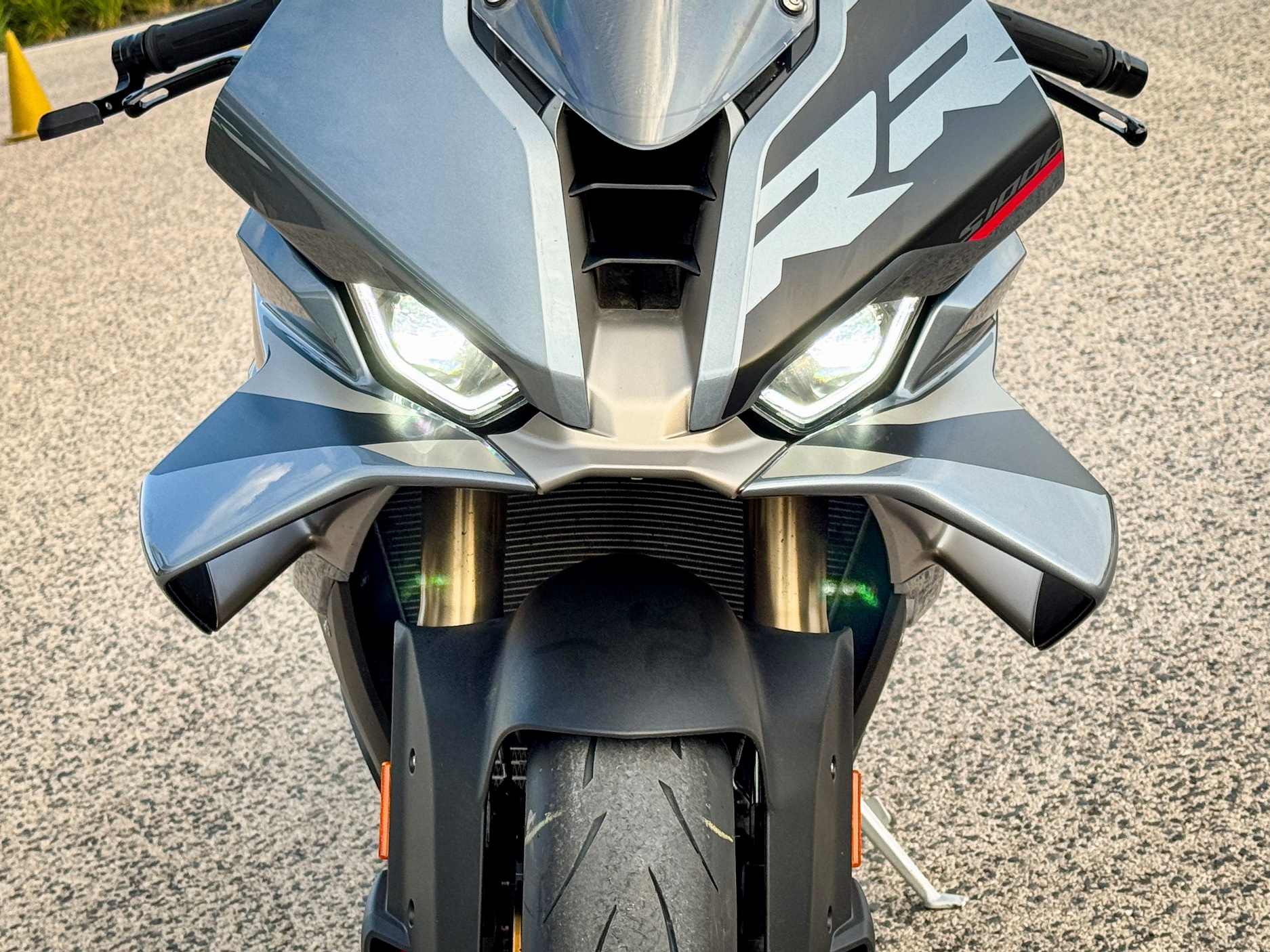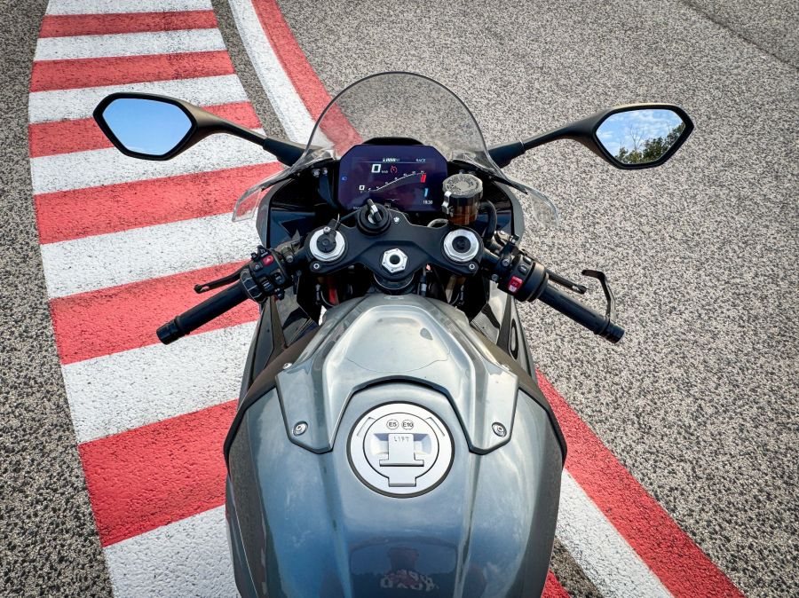 A motor első pillantásra szemből olyan, mintha fel akarna falni mindent, ami elé kerül. A teljesen áttervezett fejidom, a mélyre húzott, éles vonalak és a LED-es fényszórók agresszív tekintete egyfajta ragadozóra utaló sziluettet hoz létre. A szárnyak, amelyek immár alapfelszereltség részei, nemcsak a funkcionalitást szolgálják, hanem a motor arcberendezésének részévé válnak, mintha a filmbéli Predator állkapcsa nyílna ki. Ez a vizuális agresszió nem véletlen tökéletesen tükrözi a motor karakterét és azt a célt, amire tervezték: a sebességet, a precizitást és a versenypálya uralását.