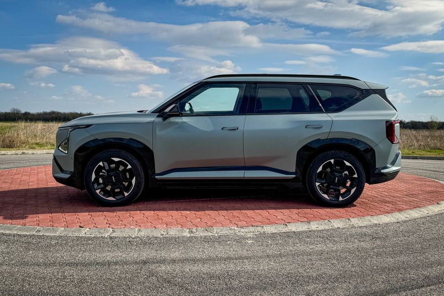 A tesztautónk csodálatos, selymes hatású matt fényezést kapott, amely még inkább kiemeli az autó határozott, geometrikus éleit. Ez az elegáns és modern árnyalat egyértelműen jelzi a prémium ambíciókat. Van az autónak egy sajátos kisugárzása: amikor az EV5 beáll egy parkolóba, a körülötte álló autók – legyen szó akár modernebb konkurensekről – egyszerűen öregnek és elavultnak tűnnek mellette. Olyan vizuális ugrás ez, amivel a Kia magabiztosan vezeti az élbojt a formaterv terén. A tesztautón lévő 19 colos kerekek és a süllyesztett kilincsek csak tovább emelik az exkluzív hatást.